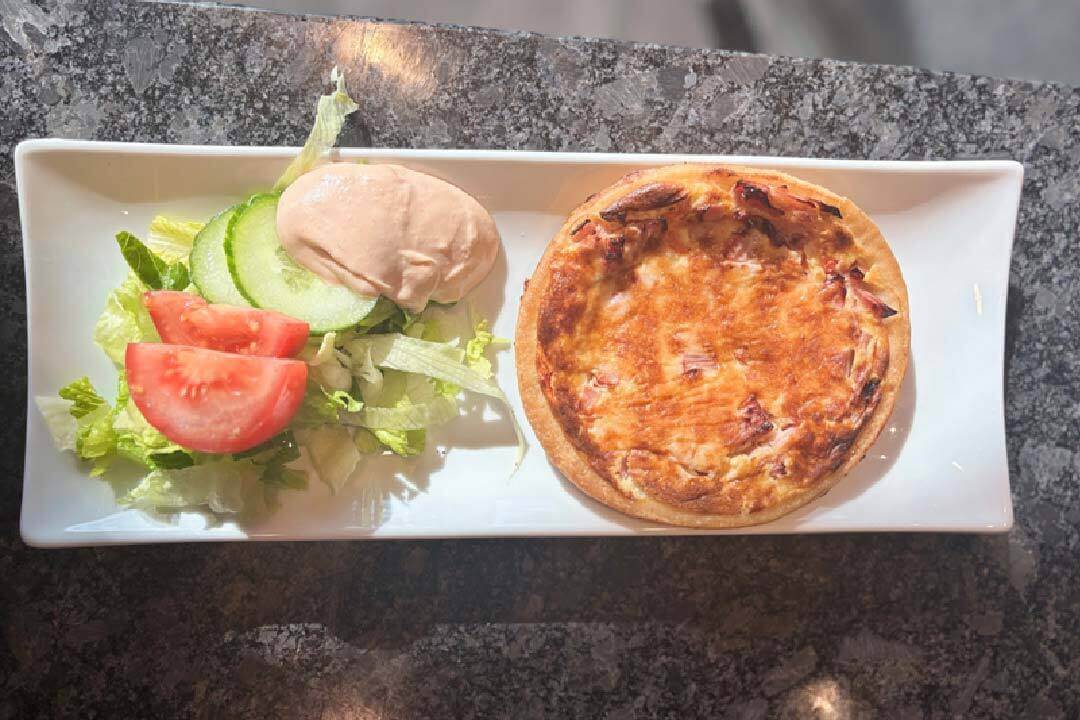 Det här är handgjort peinirli deg med gouda ost och bacon serveras med sallad och dressing för 89